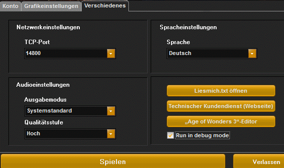 Wählen Sie im Launcher "Verschiedenes" ("Miscellaneous") und aktivieren Sie dort den Debug-Modus ("Run in debug mode").
