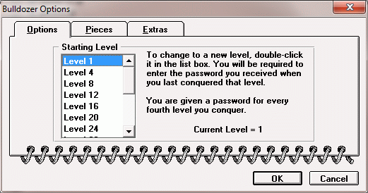 Wählen Sie Game/Options. Klicken Sie einen Level aus der Liste doppelt an. Geben Sie das richtige Paßwort ein, um den Level zu spielen. Es gibt nur alle vier Levels ein Paßwort.