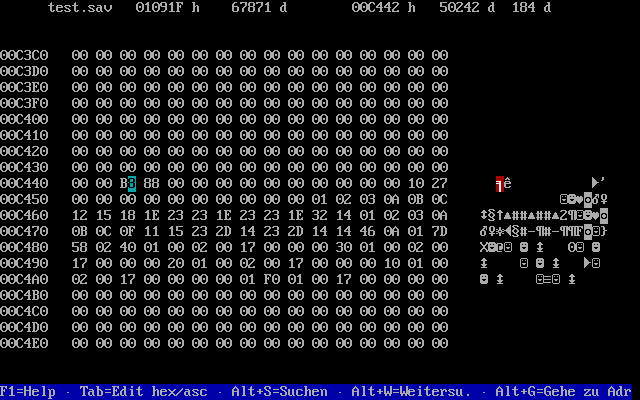 Ein Sektor sind 512 Bytes; die Adreßangabe ist dezimal. Daher sind die Adressen 98 * 512 plus 66-69 gemeint, ab 50242 oder hexadezimal C442. Bei unserem testweise abgespeicherten Spielstand TEST.SAV vom Spielbeginn fanden wir an der Adresse C442 tatsächlich die Werte B8 88. Das ergibt (weil man die Bytes ja vertauscht) 88B8 hex = 35.000. Und 35.000 Punkte hat man am Anfang.