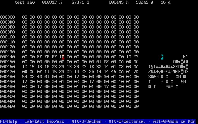 FF FF FF 10 ergeben 10FFFFFF hexadezimal = 285.212.671 dezimal. Und wenn man FF FF FF 10 ab Adresse C442 in den Spielstand einträgt und ihn im Spiel lädt, hat man in der Tat 285.212.671 Punkte im Spiel.