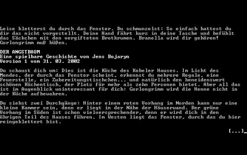 Gehe nach Süden. Öffne das Säckchen. Schütte die Krumen in den Käfig. Untersuche die Kisten. Nimm die Körner. Schütte sie in den Käfig. Gehe hoch.