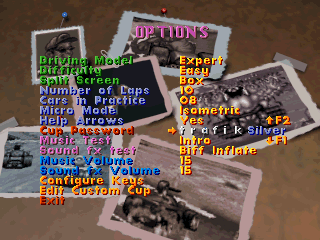Geben Sie folgende Cheats bei Cup Password im Options-Menü ein. Sie müssen dazu bei jedem Buchstaben mit [F1] und [F2] durch das Alphabet blättern, um das richtige Zeichen auszuwählen.