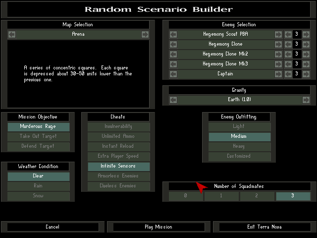 Wenn Du fertig bist, dann gehe auf Knopf der Buildertafel, wo drei Knöpfe sind. "Cancel" (stornieren) führt Dich aus dem Builder heraus zurück zum Hauptmenü von Terra Nova. "Exit Terra Nova" beendet Terra Nova völlig. "Play Mission" (Mission spielen) aber akzeptiert Deine Szenariokonfiguration und bringt Dich zum Ausstattungsbildschirm. Statte Dich selbst und Deine Kampfgefährten aus und wenn Du damit fertig bist, fängt das "Random Scenario" (Zufallsszenario) an!
