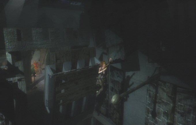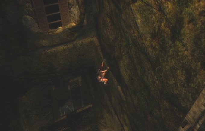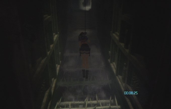 Screenshot Folgt den Stiegen nach unten bis zum Abgrund, um diesen zu überqueren müsst ihr euch jedoch links am Vorsprung entlanghangeln. Springt schnell zum nächsten Vorsprung und lasst euch nach unten fallen, dann lauft ihr schnell weiter und springt zur nächsten Plattform bevor ihr mit nach unten gerissen werdet. Schwingt euch über die Stange weiter, von dort hängt ihr euch an die Kante und springt nach rechts zur nächsten Kante. Hangelt euch nun schnell weiter und lasst euch nach unten fallen, weiter geht es über das Seil. Schwingt euch schräg zur nächsten Plattform, sobald ihr dort gelandet seid lauft ihr schnell weiter bevor diese einstürzt.