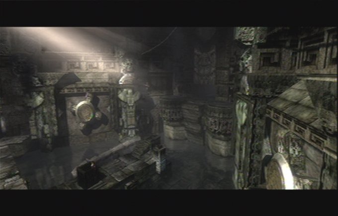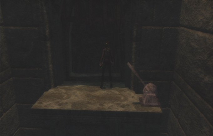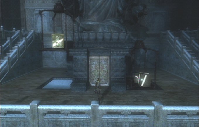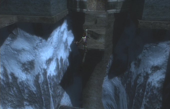 Screenshot Geht nach unten, nach der Sequenz läuft ihr zurück nach vorne, die Tür könnt ihr mit dem Schwert zerstören. Nun müsst ihr den Raum durchqueren, lauft dazu zunächst schräg zu der kleinen quadratischen Plattform. Springt nun weiter geradeaus zur größeren Plattform und lauft von hier nach rechts zur ebenfalls etwas längeren Plattform. Nun geradeaus zur kleineren Plattform, und von dieser genau geradeaus um das anderen Ende des Raumes zu erreichen. Beim letzten Sprung lohnt es sich kurz zu warten, die Plattform bewegt sich zunächst noch ein Stück nach vorne bevor sie einbricht.