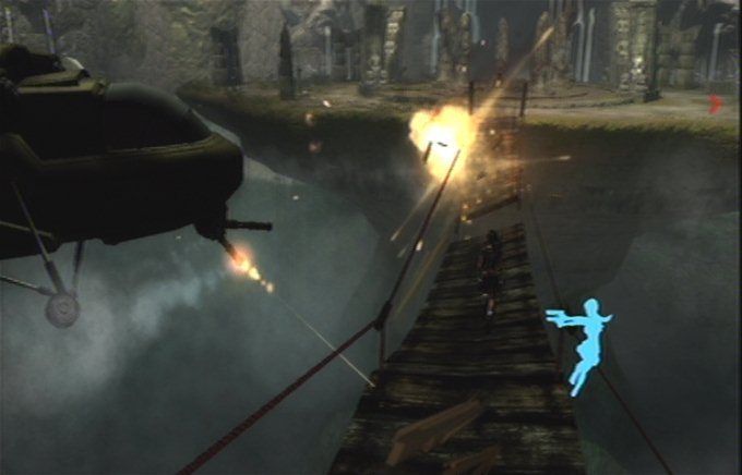 Screenshot Kümmert euch um die überlebenden Gegner, dann schaltet ihr die Feinde die links auftauchen aus. Haltet euch nun links und lauft den Weg nach oben, am Ende schwingt ihr euch über die Liane auf die andere Seite. (Ihr müsst jedoch zuvor ein Stück nach oben klettern) Jetzt ballert ihr euch weiter den Weg entlang, seid hier jedoch vorsichtig und bleibt in Bewegung damit ihr nicht getroffen werdet. Sind alle Feinde beseitigt könnt ihr die Stiegen nach oben laufen und den Tempel betreten.