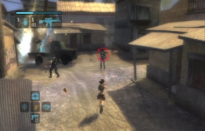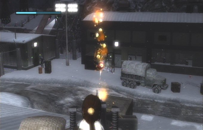 Screenshot Die Motorradfahrt ist relativ einfach. Gebt immer Vollgas und ballert dabei nebenbei die Gegner ab die auftauchen. Versucht zwischendurch die Medi-Kits einzusammeln sofern ihr welche benötigt. Nach einem längeren Stück Fahrtweg fährt ihr über eine Brücke, hier müsst ihr euch zunächst rechts halten, dann links. Nun folgt ein Sprung, nach diesem haltet ihr euch rechts und es folgt noch ein weiterer Sprung. Bei den Lastwägen am Ende müsst ihr euch zunächst links halten und den Lastwagen überholen. Als nächstes haltet ihr euch rechts und wartet bis die Kisten weg sind. Erledigt nun die beiden Gegner, dann könnt ihr auf die Ladefläche des Lastwagens fahren.