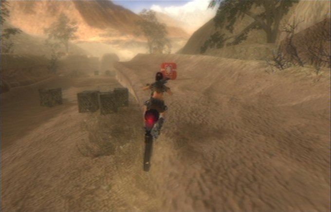 Screenshot Als nächstes folgt wieder eine gerade Strecke, schaltet auch hier wiederum so schnell wie möglich eure Verfolger aus, am Ende kommt ihr wieder zu einer extra Strecke. Sobald ihr zum Zug zurückkehrt springt ihr zweimal über den Zug. Hier solltet ihr euch beim ersten Sprung in der Mitte der Schanze aufhalten. Beim zweiten Sprung müsst ihr aufpassen dass ihr nicht links in den Bäumen landet, haltet euch daher eher rechts. Zu guter letzt müsst ihr nun auf den Zug fahren, seid besonders vorsichtig und versucht die Kontrolle über das Motorrad zu behalten, lenkt am besten so wenig wie möglich.