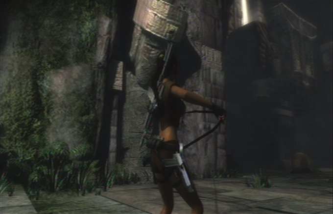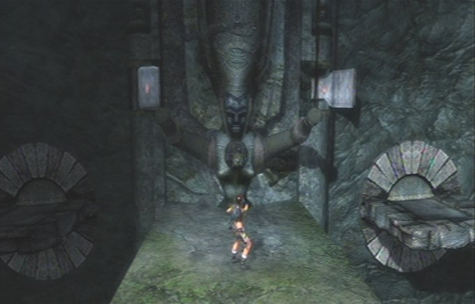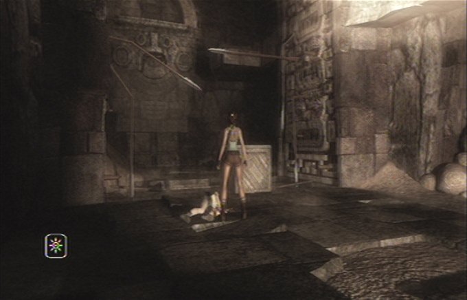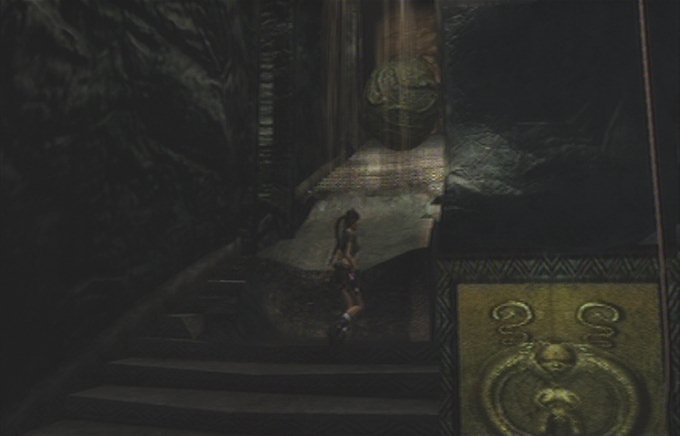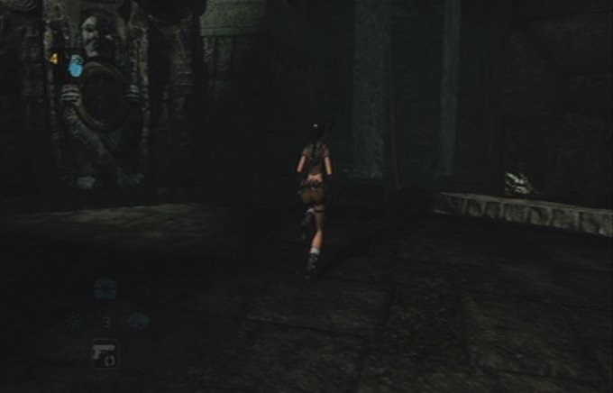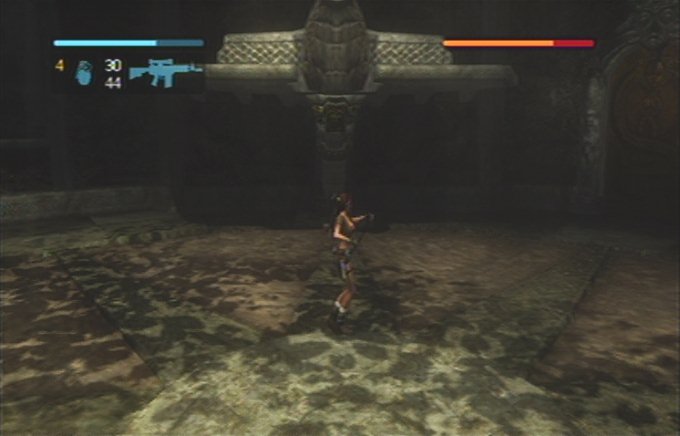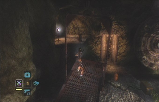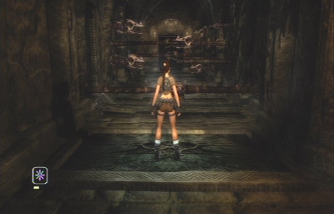 Screenshot Nach der Sequenz wird es etwas gefährlich, sobald die blaue Laradarstellung in der Ecke auftaucht könnt ihr euch bereit machen. Ihr müsst nun schnell mit Lara über das Hindernis springen, dann weiterlaufen und über ein weiteres Hindernis klettern. Nun lauft ihr noch schnell weiter und landet schließlich in einem größeren Raum. Klettert hier links nach oben und rollt die große Kugel nach unten. Rollt sie hier weiter auf die druckempfindliche Bodenplatte, passt jedoch auf das sie nicht gleich weiterrollt.