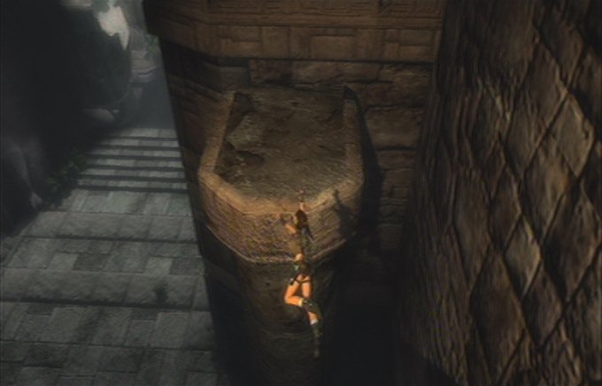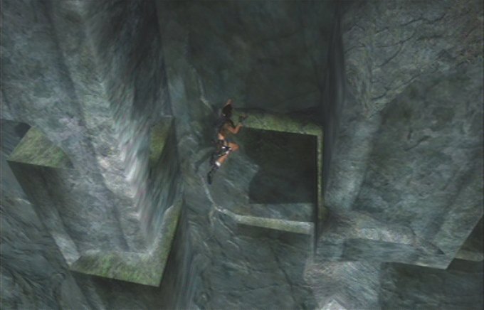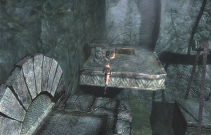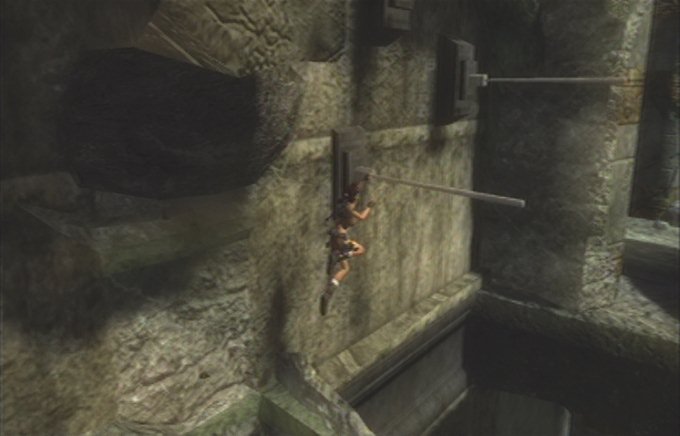 Screenshot Schiebt die Kiste geradeaus in den Raum auf die Druckempfindliche Bodenplatte. Achtet dabei das ihr die Kiste voraus schiebt sodass die Fallen auf die Kiste treffen. Schiebt die Kiste auf den linken Teil der Bodenplatte, dann könnt ihr nach oben klettern. Springt auf die aktivierte Falle und schwingt euch weiter geradeaus auf die höher gelegene Ebene. Von hier aus springt ihr weiter geradeaus auf den Vorsprung an der gegenüberliegenden Wand. Hangelt euch nun nach links weiter, dann könnt ihr in den nächsten Raum nach unten springen.