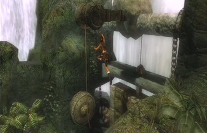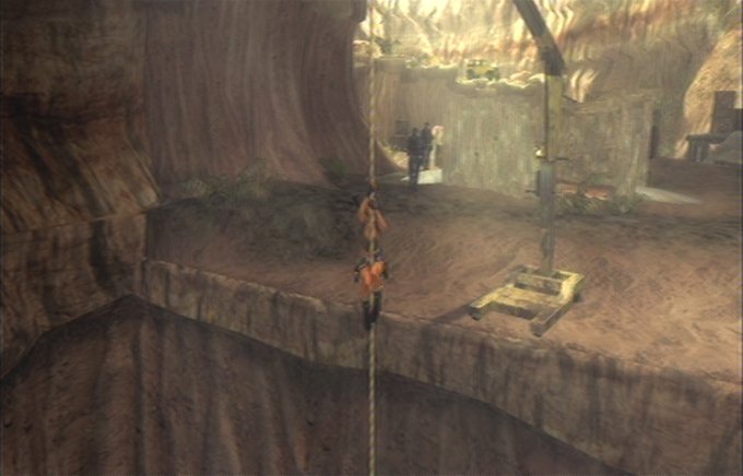 Klettert nun nach oben und springt auf die nächste Plattform. Von hier könnt ihr euch über die ausgefahrene Falle auf das Seil weiterschwingen das euch schließlich zum Ausgang des Raumes befördert. Folgt jetzt dem Weg - zwischendurch müsst ihr euch noch über einen Abgrund hangeln - bis ihr nach einer Zwischensequenz wieder in der Gegenwart landet.