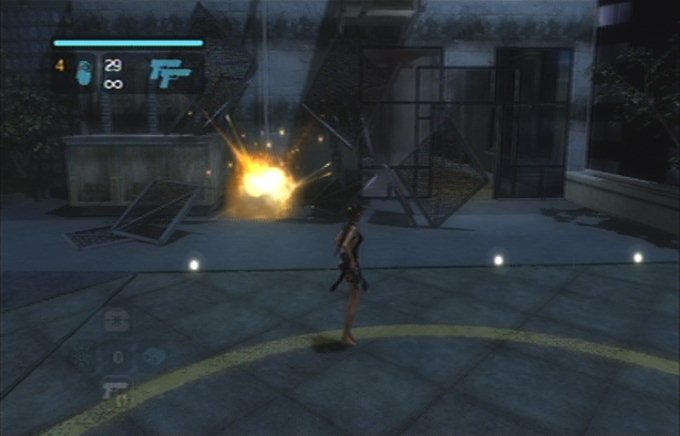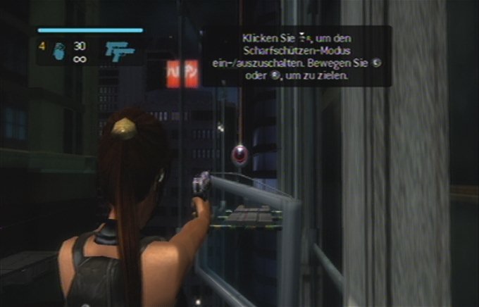 Screenshot Haltet euch links und geht nach draußen. Rechts könnt ihr auf das Objekt an der Wand schießen, haltet jedoch genug Abstand damit ihr nicht von der Explosion getroffen werdet. Klettert die nun freigelegte Stange an der Wand nach oben um auf das Dach zu gelangen. Geht auf das Glasdach, die Dachluke könnt ihr mit Hilfe eures Magnethakens öffnen. Springt nach unten und folgt dem Weg bis zum Motorrad.