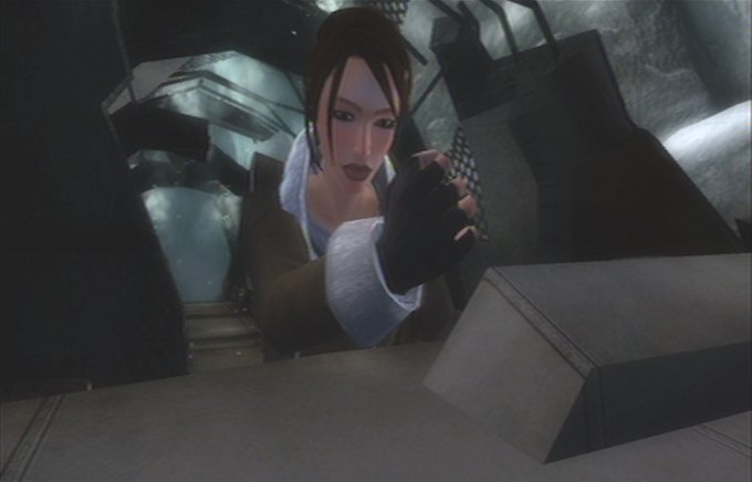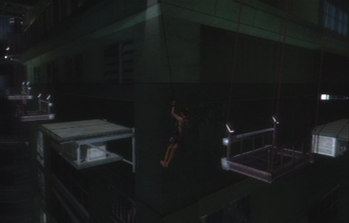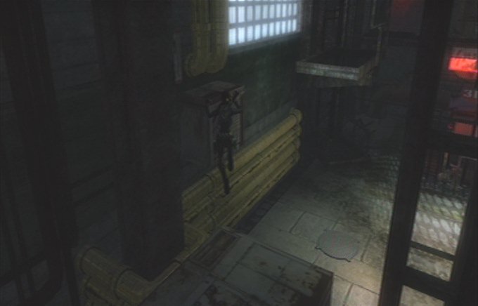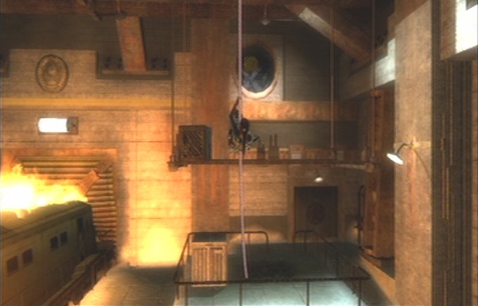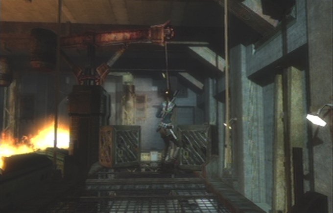 Screenshot Lasst euch nach unten fallen und benutzt erneut den Magnethaken um den Kran zu euch zu bewegen, dann schwingt ihr euch mit dem Seil zu dem Ventilator am anderen Ende des Raumes. Um nach oben zu gelangen springt ihr an die Wand wo ihr euch am schmalen Vorsprung festhalten könnt. Von hier aus springt ihr nach oben und folgt dem Verlauf des Ventilatorschachtes.