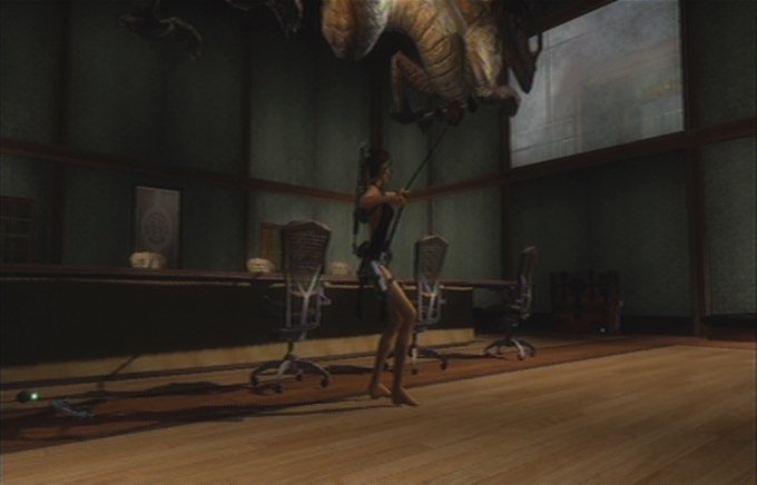 Screenshot Sind alle Kisten richtig positioniert haltet ihr euch links und klettert die Kette nach oben. Springt nun auf den Vorsprung geradeaus weg und hangelt euch diesen nach rechts entlang. Springt am Ende nach oben und hangelt euch über die Kette auf die andere Seite, lasst euch hier wieder nach unten fallen und hangelt euch nach rechts, über die Stange gelangt ihr schließlich zu dem offenen Tor. Als nächstes folgt eine Actionsequenz, hier müsst ihr zunächst die B-Taste drücken damit sich Lara duckt, dann die A-Taste.
