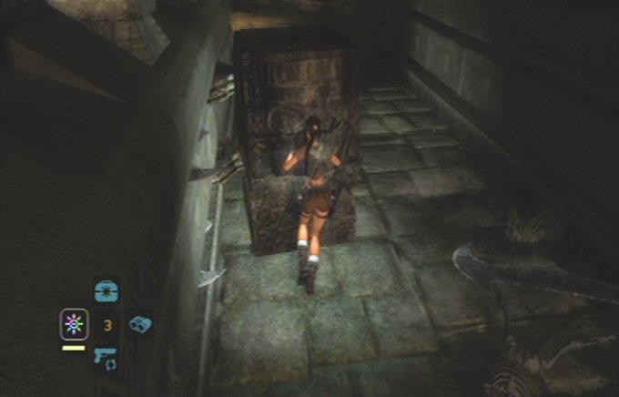 Screenshot Lauft die Stiegen nach unten und kümmert euch um das Raubtier, dann folgt ihr vorsichtig dem Weg weiter bis zur ersten Falle. Wartet bis die Wände auseinander gehen, erst dann könnt ihr schnell durchlaufen. Bei den nächsten Fallen schnappt ihr euch den Käfig und zieht ihn hinter euch her, sodass Lara als erstes die Falle berührt. Wartet zunächst vor der ersten Falle bis sie sich öffnet, dann schiebt ihr den Käfig schnell hinein und sobald Lara und der Käfig zwischen den Wänden sind kann nichts mehr passieren. Zieht nun den Käfig hinter euch her bis zur nächsten Falle, hier müsst ihr warten bis sie sich öffnet, dann könnt ihr sie schnell betreten, achtet hier nun vor allem darauf das ihr euch nicht irgendwie seitlich dreht. Auf der anderen Seite angelangt folgt ihr dem Weg bis in den großen Raum.