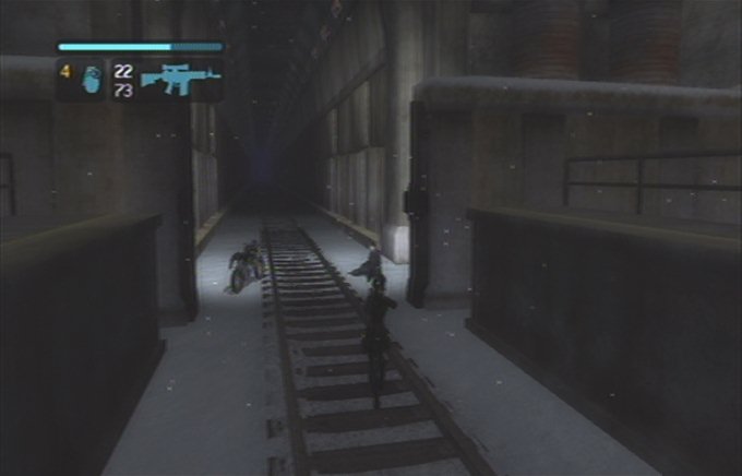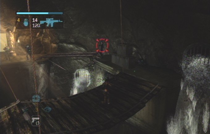 Screenshot Aktiviert eure Taschenlampe und folgt dem dunklen Pfad, über die Abgründe könnt ihr euch mit eurem Magnethaken schwingen. Bei der Brücke mit den Gegnern müsst ihr besonders vorsichtig vorgehen. Betretet am besten nicht die Brücke, sollte diese von einer Granate getroffen werden stürzt sie sofort ein. Bekämpft die Gegner aus der Entfernung, ihr könnt euch auch mit dem Magnethaken über den Abgrund schwingen.