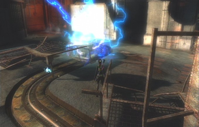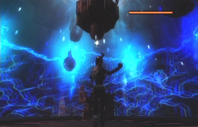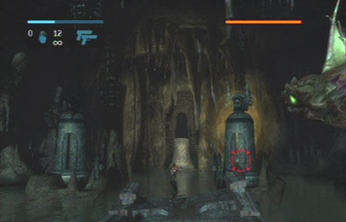 Screenshot Lauft nach der Sequenz nach draußen und immer geradeaus. Nach einer weiteren Sequenz lauft ihr einfach weiter geradeaus bis zum Ende des kleinen Steges. Benutzt eure Waffe und schießt auf eine der beiden Säulen rechts oder links im Raum, wenn ihr sie trefft sollte diese gelbe Schwingungen aussenden. Das sollte nach kurzer Zeit den Gegner anlocken, nun könnt ihr schnell den Magnethaken einsetzen und so den Käfig nach unten holen und den Gegner verletzen. (Achtung ihr habt dazu nur sehr wenig Zeit) Wiederholt das mit allen vier Säulen, dann ist der Gegner besiegt, vermeidet es jedoch während des Kampfes unbedingt ins Wasser zu fallen.
