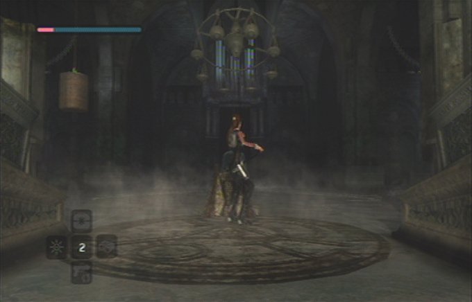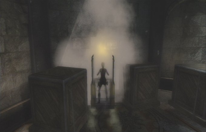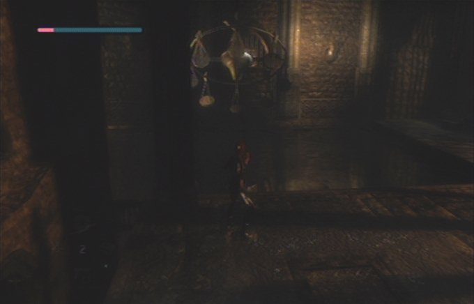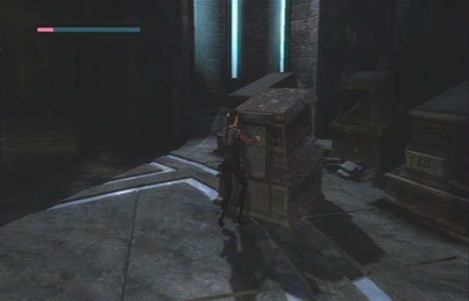 Screenshot Aktiviert am Ende des Ganges den Schalter, dann folgt ihr dem Weg bis links ein Wasserbecken auftaucht. Schwimmt dieses bis zum Ende und geht rechts an Land. Zieht den Kronleuchter mit Hilfe des Magnethakens zu euch her, dann lässt ihr ihn los und er sollte gegen das Gitter an der gegenüberliegenden Wand schlagen. Nun könnt ihr den Sarg mit Hilfe des Magnethakens nach unten ziehen, stellt euch auf diesen und zieht euch zurück zum Anfang des Wasserbeckens. Jetzt müsst ihr den Sarg noch zur Druckempfindlichen Bodenplatte ziehen, dann könnt ihr durch die nun offene Tür weitergehen.
