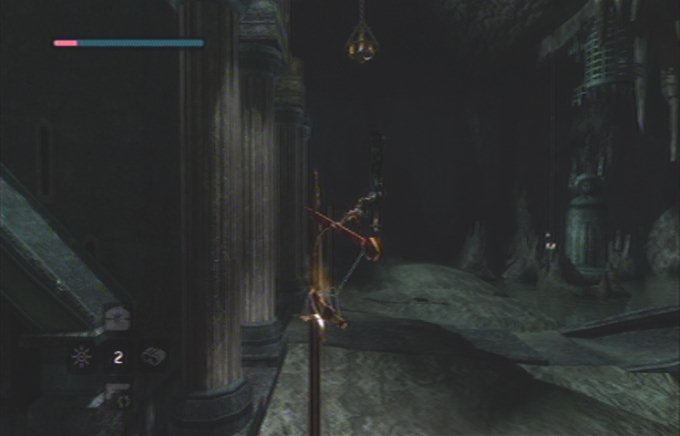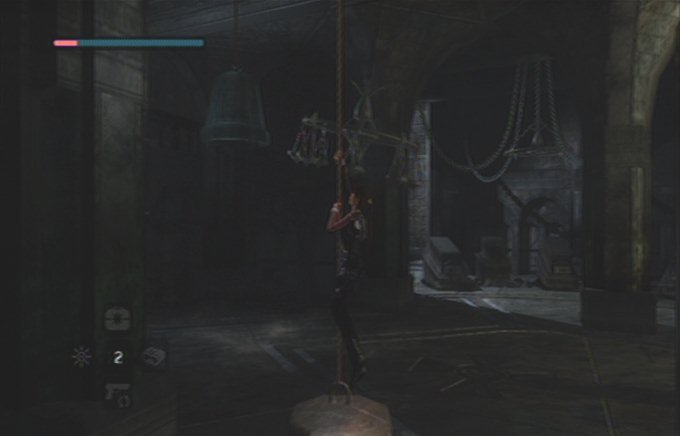 Screenshot Screenshot Blickt als nächstes genau geradeaus, sodass sich der Kronleuchter vor euch in einer Linie mit der Glocke am Boden befindet. Benutzt nun den Magnethaken um den Kronleuchter zu schwingen, dann lässt ihr los. Klettert links die halb zerstörte Säule nach oben und springt nach vorne auf das Gewicht. Nun sollte sich die Glocke nach oben bewegen und wird vom noch immer schwingenden Kronleuchter berührt.