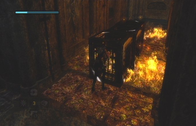 Screenshot Nutzt nun diese Kiste zunächst um die Fallen in der Mitte zu stoppen, dann könnt ihr die zuvor eingeklemmte Kiste holen und in den mittleren Bereich schieben. Sind hier die Fallen blockiert holt ihr wiederum die letzte Kiste und schiebt sie durch den größeren Raum zu den nächsten Fallen vor dem Feuer. Holt nun die andere Kiste und schiebt sie weiter bis zum Feuer. Nun holt ihr noch die Kiste die die Fallen blockiert und schiebt sie hinter die zweite Kiste, so könnt ihr nun das Feuer überqueren ohne verletzt zu werden.