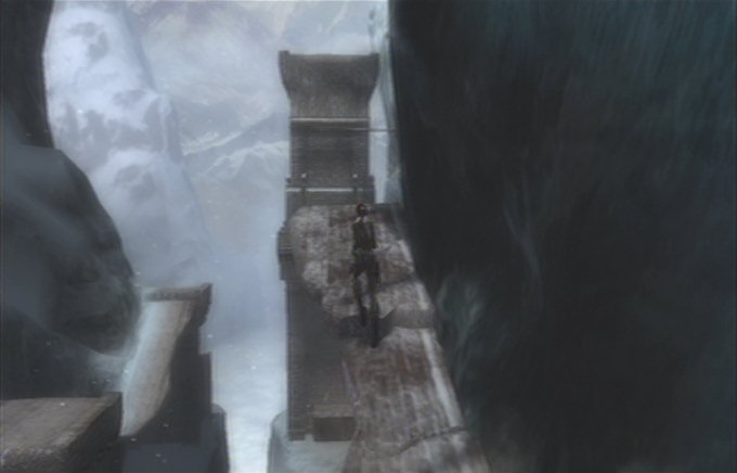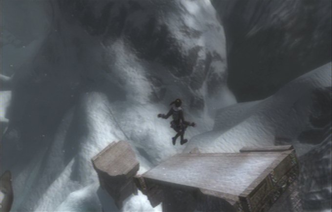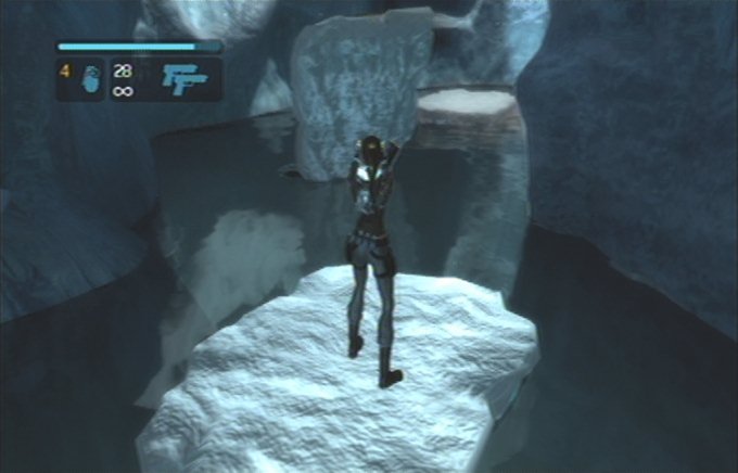 Screenshot Lauft bis nach vorne zum Wasser. Springt von einer Eisscholle zur nächsten, wenn ihr nicht mehr weiterkommt zuckt ihr eure Pistolen und schießt auf den großen Eiszapfen an der Decke. In der nächsten Höhle müsst ihr zunächst warten bis die Eisschollen auftauchen, dann springt ihr von einer Eisscholle zur nächsten und gelangt so nach links weiter in die Höhle. Ihr könnt das Gebiet schließlich auf der rechten Seite verlassen, folgt nun immer den Stiegen nach oben bis ihr in einem größeren Raum landet.