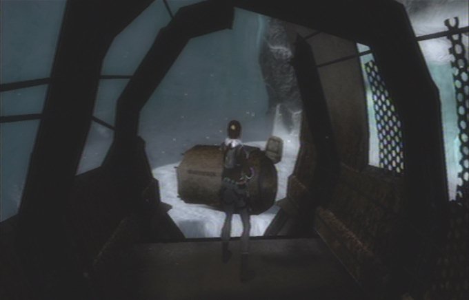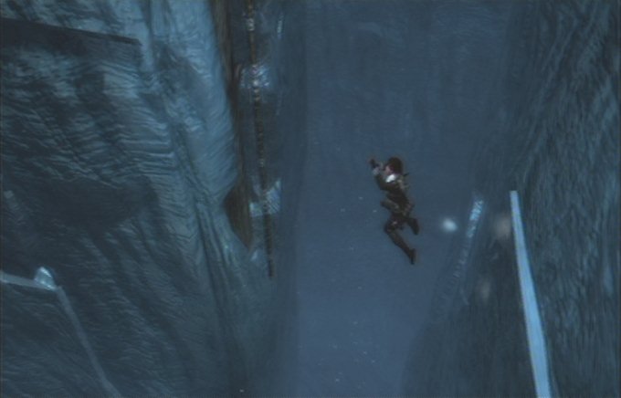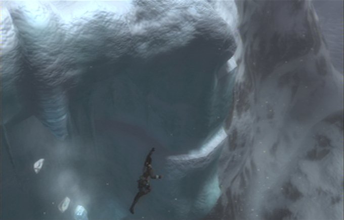 Screenshot Am Ende des Weges springt ihr geradeaus auf den eingefrorenen Teil des Flugzeuges. Lasst euch hier langsam nach unten fallen, ihr müsst zwischendurch auch zur gegenüberliegenden Wand wechseln. Beim Flugzeugwrack angelangt kümmert ihr euch um das Raubtier, dann benutzt ihr den Magnethaken um eine der zerstörten Turbinen in den Wrackteil des Flugzeugs zu schaffen. Ihr dürft nicht zu weit in das Flugzeug gehen, erst wenn der Wrackteil ein Gegengewicht bildet (Es sollte außerdem ein Checkpoint aktiviert werden) könnt ihr gefahrlos das Wrack betreten.