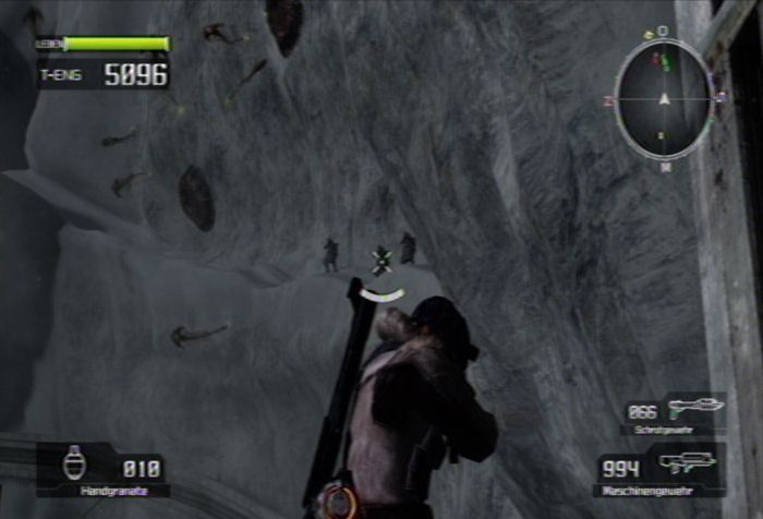 und tauscht ihn gegen eure Schrotflinte. (Das MG solltet ihr behalten) Im Gebäude schießt ihr zunächst schnellstens auf die