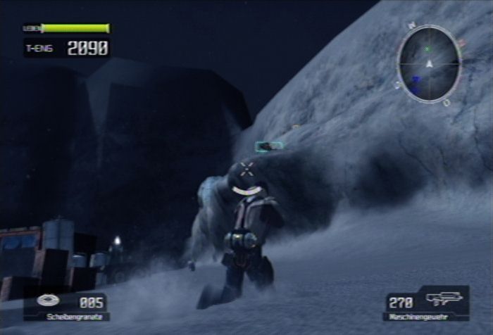 Lauft nach vorne und schnappt euch den VS der hier bereits auf euch wartet. Schaltet sämtliche Gegner aus die sich im Gebiet weiter unten befinden, konzentriert euch besonders auf die stationären Geschütze die einige Probleme verursachen. Springt schließlich nach unten und kümmert euch um die „Reste“ bevor ihr durch den Tunnel weiterläuft. Ihr müsst dazu die Türen zerstören, am anderen Ende findet ihr einen neuen VS. Springt durch das Loch in der Decke nach oben und folgt dem Weg weiter rechts den Berg nach oben. Hier springt ihr wiederum durch ein Loch nach unten in einen Tunnel. Kämpft euch auch hier den Weg entlang bis ihr in einem größeren Raum landet.