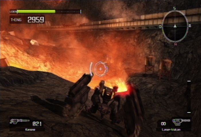 Ihr müsst nach links weiter, aktiviert außerdem die Datenstation die auf den Containern steht. Kümmert euch als nächstes um den Mech auf dem Turm, dann müsst ihr auf die andere Seite der Lava. Passt hier besonders gut auf, ein kleiner sehr flinker feindlicher VS lauert euch hier auf, er ist dank Raketenwerfer ein ernstzunehmender Gegner. Ihr müsst als nächstes nach rechts oben gelangen zurück auf die Straße. Hier findet ihr neben einer Datenstation einen weiteren VS den es zu zerstören gilt. Weiter vorne gelang ihr rechts in da Gebäude. Zerstört auch diesen feindlichen Mech, im nächsten Raum kümmert ihr euch um die schwebenden Akriden sowie die menschlichen Gegner. Verlässt das Gebiet schließlich durch den Schacht im Boden.