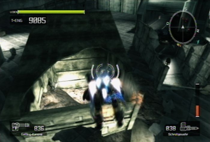 Nach dem Kampf schnappt ihr euch einen neuen VS und einige Waffen die noch übrig geblieben sind. Ihr könnt durch die Überreste des Gegners zu der Tür gelangen. Folgt diesem Schacht bis ihr wieder in einem großen Raum angelangt seid. Kümmert euch um sämtliche Gegner, sowohl feindliche Mechs, Fußsoldaten als auch Akriden, und sammelt immer die Thermalenergie der besiegten Feinde ein. Aktiviert außerdem alle Datenstationen und sorgt dafür dass eure Thermalenergie möglichst hoch bleibt. Schnappt euch zu guter letzt noch einen neuen VS bevor ihr das Gebiet weiter vorne verlässt.