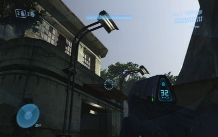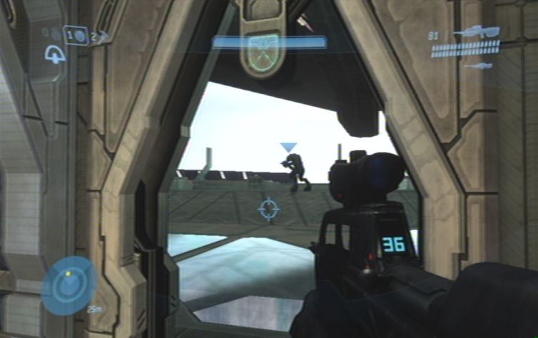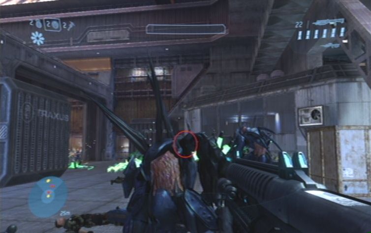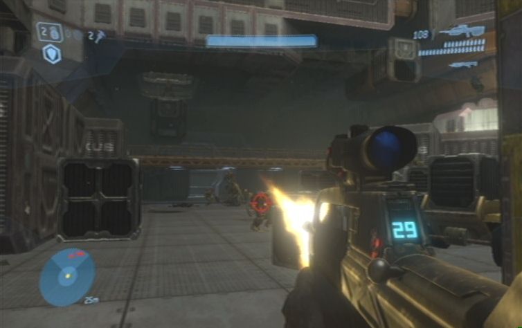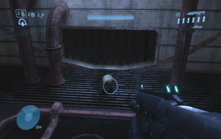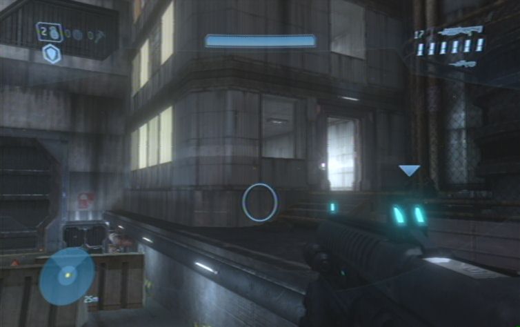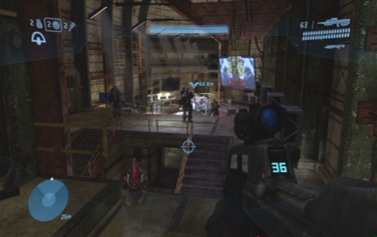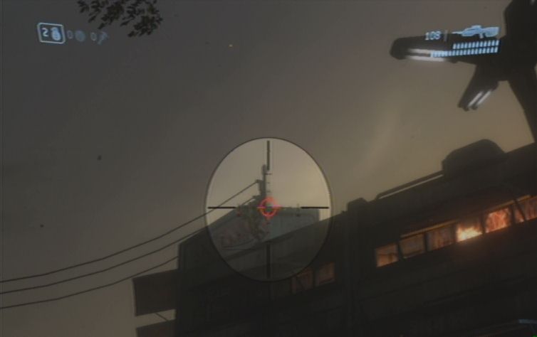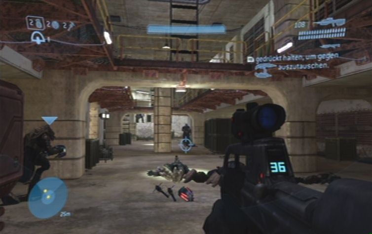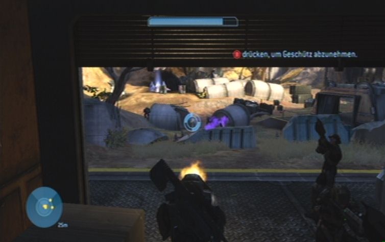 Solltet ihr eine Waffe mit Zoom dabei haben kö,nnt ihr zunächst von hier oben einige der Feinde weiter unten erledigen. Konzentriert euch hierbei auf die Brutes, diese kö,nnt ihr meistens mit einem Kopftreffer besiegen. Lauft schließlich nach rechts, und den Pfad nach unten um die restlichen Gegner aus der Nähe zu erledigen. Ganz unten angelangt haltet ihr euch nach wie vor rechts, wo ihr zu einem Gebäude kommt. Springt nun am besten über einen Container nach oben, und betretet das Gebäude durch eine der Fensterscheiben, ihr kö,nnt diese im Nahkampf zerstö,ren. Vom oberen Stockwerk aus habt ihr eine hervorragende Position um erneut mit einer Fernkampfwaffe die Feinde weiter unten, auf der Brücke, zu erledigen.
