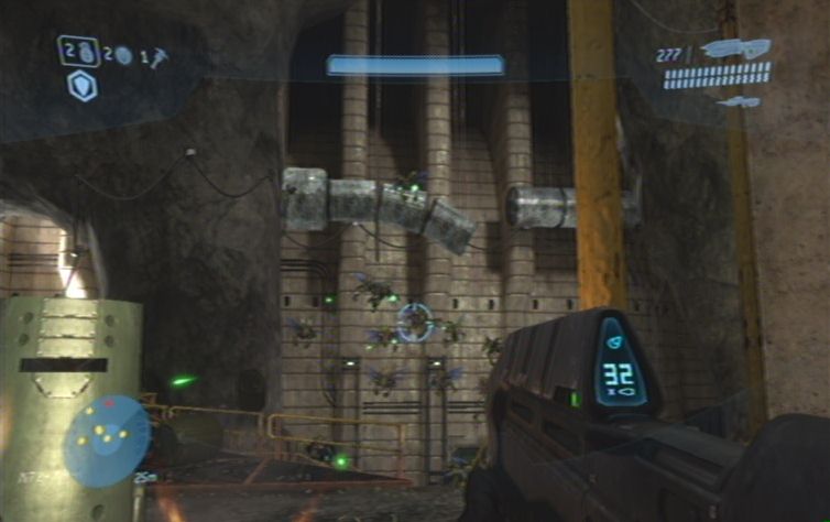 Ganz oben angelangt lauft ihr nach rechts zu dem großen Tor. Schnappt euch das automatische Geschütz, und aktiviert es, ein weiteres befindet sich hier ebenfalls gleich vor dem großen Tor. Wartet nun auf die Flood, sobald diese auftauchen beginnt auch schon der Kampf. Bleibt in Bewegung, und erledigt die meisten Feinde so gut es geht im Nahkampf, mit der Schrotflinte. Bleibt außerdem nach wie vor in der Nähe eures Verbündeten, damit ihr etwas geschützter seid. Wenn der Kampf vorbei ist füllt ihr eure Munitionsvorräte auf, weiter geht es durch das offene Tor. Folgt einfach den Gängen entlang, bis ihr im Kontrollraum landet.
