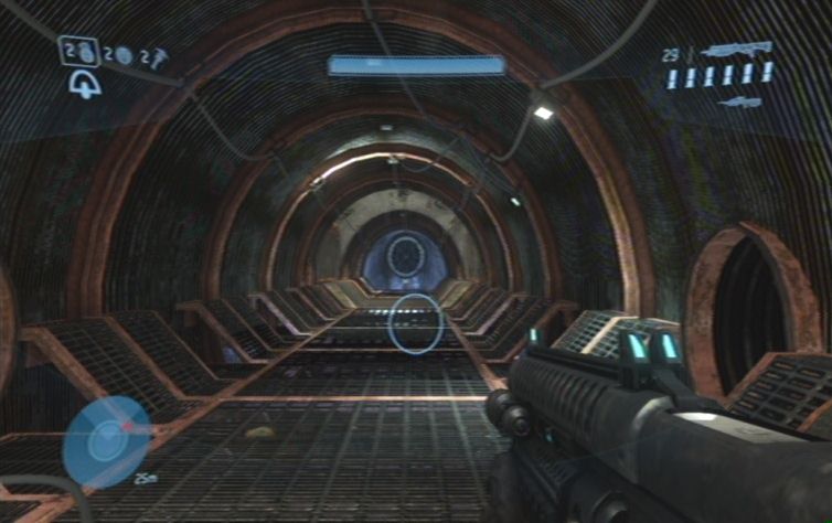 Zurück im unteren Bereich lauft ihr zu der nächsten Zielmarkierung, füllt jedoch zuvor eure Munitionsvorräte auf. Kämpft euch nun vorsichtig durch den nächsten Gang. Haltet euch hierbei immer wieder bereit die Flucht nach hinten anzutreten, falls euch zu viele Gegner gleichzeitig das Leben schwer machen. Am Ende dieses langen Ganges erwartet euch eine weitere Schleuse, und hinter dieser, wie sollte es auch anders sein, wiederum ein etwas größerer Raum. Erledigt die Flood geradeaus vor euch, am besten noch von der Tür aus. Verballert eure ganze Munition, und lauft zunächst den ganzen Weg zurück zu den letzten Waffen, um etwas Nachschub zu holen.