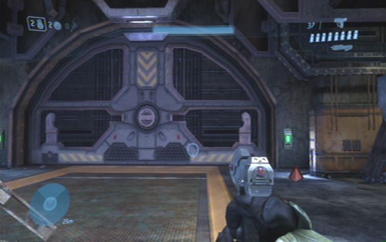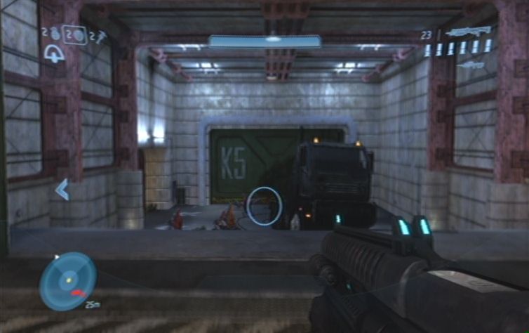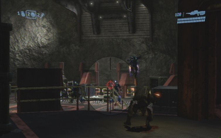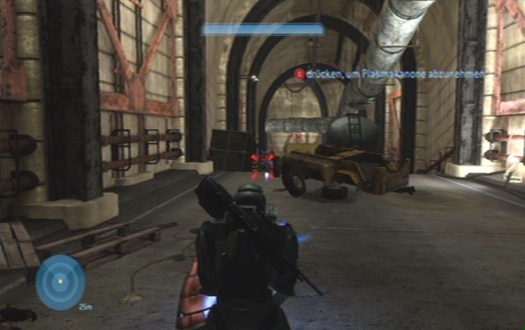 Verschwindet nun aus diesem Gebiet, und lauft die Rampe nach oben. Folgt den anderen durch das Gebäude, hier findet ihr außerdem Munition für eure Projektilwaffen. Ihr könnt euch auf eurem Weg durch das Gebäude kaum verlaufen, am Ende stößt ihr wiederum auf einige Gegner. Schaltet diese zunächst aus, und kämpft euch in den großen Hangar weiter. Lauft schnell links die Treppe nach oben, und bemannt das stationäre Geschütz im oberen Bereich. Damit schaltet ihr zunächst alles aus, was durch das große Tor weiter vorne kommt. Die restlichen Feinde die sich nicht im Schussbereich des Geschützes befinden müsst ihr mit euren normalen Waffen besiegen. Im nächsten Hangar befinden sich rechts, nach einem kurzen Stück, weitere Feinde. Hier handelt es sich um Brutes, versucht am besten eine Granate zu platzieren, den Rest erledigt ihr mit der Waffe.