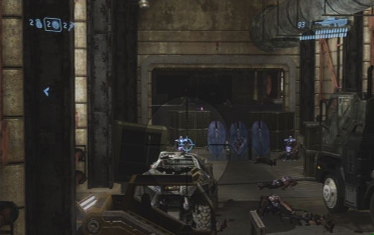 Unten, links um die Ecke lauern bereits weitere Feinde. Benutzt kurz das Plasmagewehr, leider könnt ihr es nicht wirklich weit drehen, geht also zunächst wieder in Deckung. Ebenfalls weiter vorne befindet sich ein weiteres stationäres Geschütz, um dieses solltet ihr euch als erstes kümmern. Nun nutzt ihr nach wie vor das MG, ihr könnt mit Hilfe des Zoomes sämtliche Grunts die sich am anderen Ende des Raumes aufhalten erledigen. Passt vor allem auf das stationäre Plasmagewehr auf, die Gegner werden versuchen dieses erneut zu erreichen, um euch damit das Leben schwer machen. Sobald ihr weiter nach vorne läuft müsst ihr zusätzlich auf ein weiteres Geschütz achten, da sich sowohl rechts als auch links eines befindet. Am Ende des Ganges solltet ihr nach wie vor vorsichtig sein, im Hangar vor euch befinden sich oben zwei Scharfschützen, links unten bedient ein Grunt ein stationäres Geschütz. Sobald die Luft rein ist betretet ihr den Hangar, links gelangt ihr über eine Tür weiter.