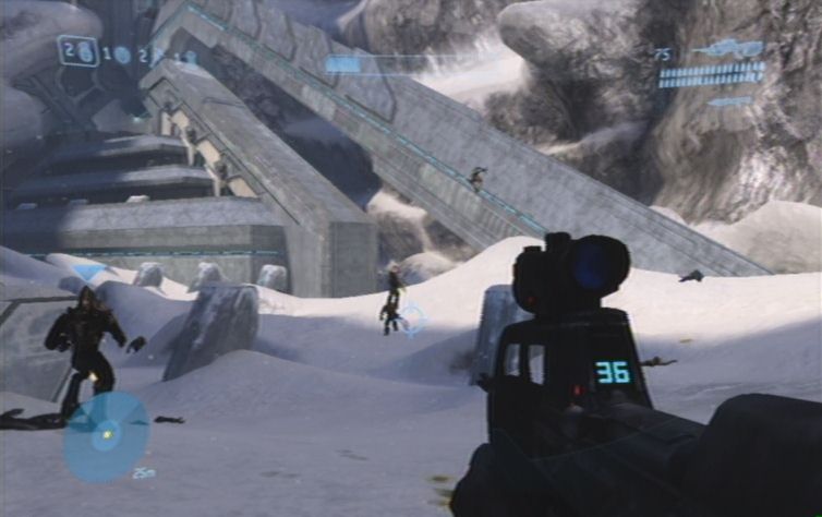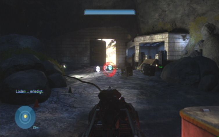 Ist die Luft rein kümmert ihr euch um die Feinde weiter draußen, benutzt am besten das MG mit der Zoomfunktion. Lauft nun nach draußen, und den Weg entlang, rechts um die Ecke lauern euch auch schon die nächsten Feinde auf. Achtet auf die Grunts sowie die Schakale, die Brutes solltet ihr selbstverständlich ebenfalls nicht unterschätzen. Folgt nun weiter den Pfad entlang, bis ihr die gesuchte Kanone sehen könnt. Lauft nach rechts unten zu dem stationären Geschütz, damit erledigt ihr zunächst alles was sich weiter vorne bewegt. Lauft nun links nach oben, bei einer Leiche findet ihr ein Scharfschützengewehr. Benutzt es um die restlichen Feinde weiter vorne zu beseitigen, es muss hierbei nicht erwähnt werden, dass ihr besser Kopftreffer landet, um Munition zu sparen.