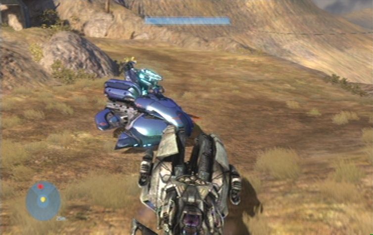 Wartet nun bis in eurer Nähe ein Pelikan auftaucht, und einen Warthog abwirft. Übernehmt wie gewohnt die Rolle des Schützens, und lasst euch zu den nächsten Feinden chauffieren. Schießt diese so gut es geht vom Ghost, wichtig ist dabei diesen so wenig wie möglich zu beschädigen. Schnappt euch nun einen der beiden Ghosts, und bewegt euch mit diesem den Hügel nach oben. Nach einem Stück befindet sich rechts, auf einem Felsen eine feindliche Stellung. Kümmert euch um diese, wichtig ist natürlich dabei vor allem das stationäre Geschütz. Nun geht es immer weiter nach oben, bis ihr zu der nächsten feindlichen Gruppe gelangt.