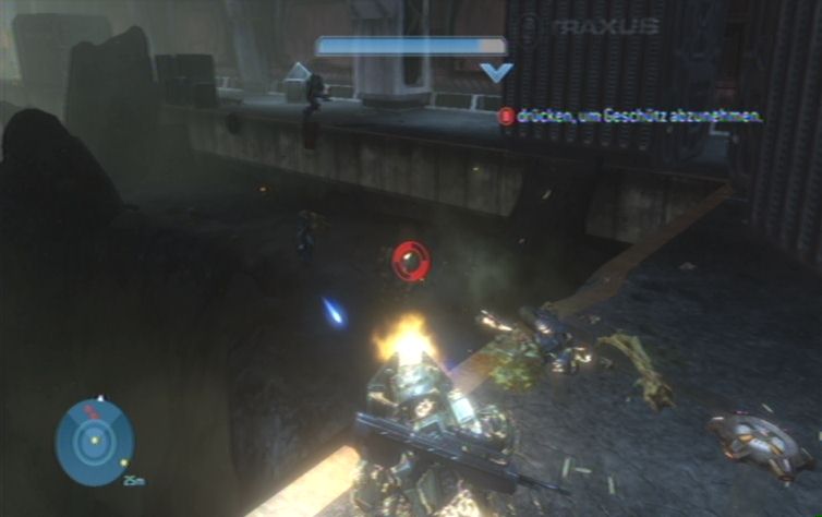 Behaltet das Scharfschützengewehr, es sei denn ihr habt bereits die Munition verbraucht. Als Zweitwaffe nehmt ihr euch das MG mit der Zoomfunktion mit. Oben am Hügel angelangt erledigt ihr links die Grunts, rechts oben, weiter vorne, beschießen euch Brutes mit besonders starken Waffen. Hier macht sich nun das Scharfschützengewehr bezahlt, erledigt damit so gut es geht die Brutes. Kümmert euch noch um sämtliche andere Feinde, bevor ihr euch euerem eigentlichen Ziel widmet, der Kanone über euch. Nehmt euch am besten eine der stärkeren Waffen von den Brutes, und schießt damit auf den blauen Kern. Dieser taucht in der Mitte der Kanone auf, sobald diese Nachladen muss. Nach wenigen Treffern sollte der Kern schließlich zerstört sein.