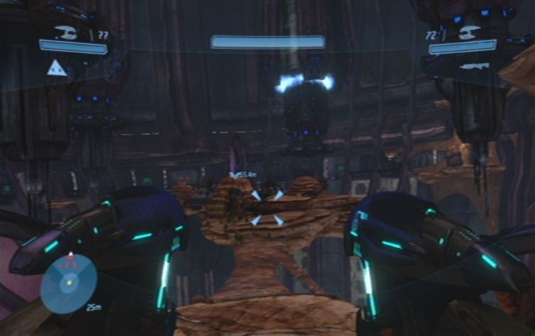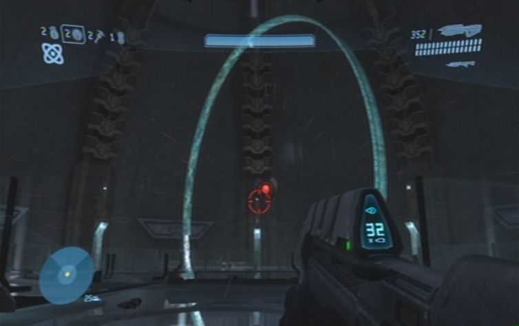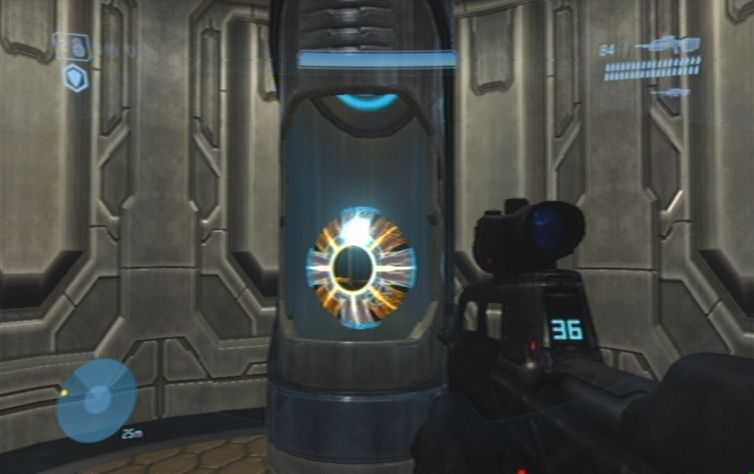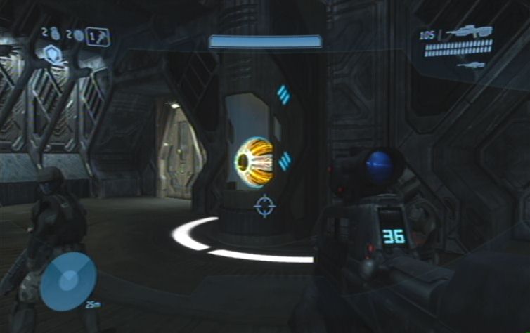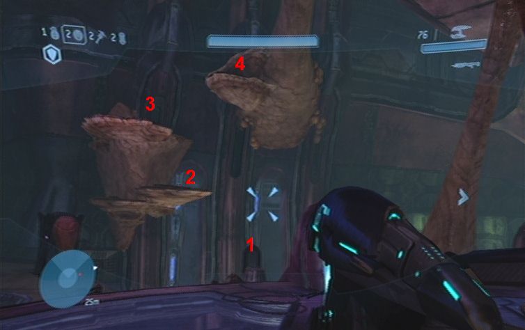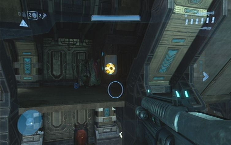Sobald das Gebiet einigermaßen gesäubert ist lauft ihr geradeaus, und nach links die Rampe nach oben. Folgt immer dem Pfad entlang, bis ihr auf die andere Seite springen könnt. Nun immer weiter nach oben, bis ihr auf weitere Feinde stößt. Schaltet diese so gut es geht aus, und achtet auch auf von hinten nachkommende Flood. Auf der obersten Ebene angelangt könnt ihr außerdem auf der anderen Seite bereits den Ausgang sehen. Um ihn zu erreichen haltet ihr euch links, folgt wiederum den Gang bis zum Ende, wo ihr nur noch zu der Tür hinspringen müsst. Der nun folgenden Gang beinhaltet keine Flood, lauft also immer weiter bis ihr im nächsten größeren Raum landet. Haltet euch zu Beginn rechts, und kämpft euch durch. Über die Mitte des Raumes erreicht ihr schließlich die andere Seite, wo sich die Zielmarkierung befindet. Weiter geht es durch den Gang, und immer geradeaus. Am Ende, in dem größeren Raum, zerschlägt ihr mit der B-Taste den Energieschild.