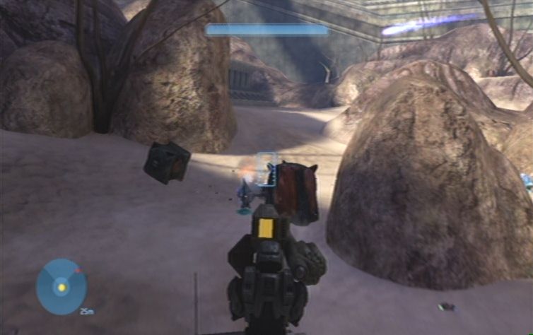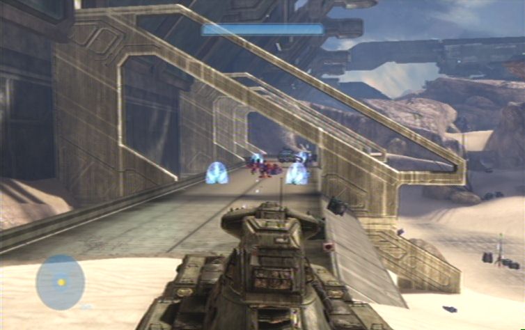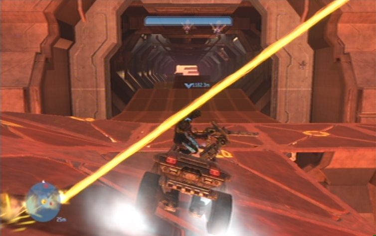 Die nun folgende Fahrt gestaltet sich leider nicht zwingend einfach. Folgt zunächst dem Pfad in Richtung der nächsten Zielmarkierung. Sobald ihr auf den Bodenplatten angelangt seid müsst ihr etwas vorsichtiger sein, achtet auf mögliche Löcher in der Struktur, und weicht diesen so gut es geht aus. Nach den Bodenplatten kommt ihr zu einem runden Bereich, haltet euch rechts und weicht den Wänden die euch im Weg stehen so gut es geht aus, meidet außerdem die Flood, eine ungünstige Explosion könnte den Warthog umschmeißen. Auf der anderen Seite angelangt erwarten euch weitere Bodenplatten. Haltet euch eher links, in der Mitte, da rechts einige Löcher freigesprengt werden.
