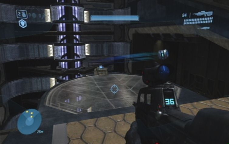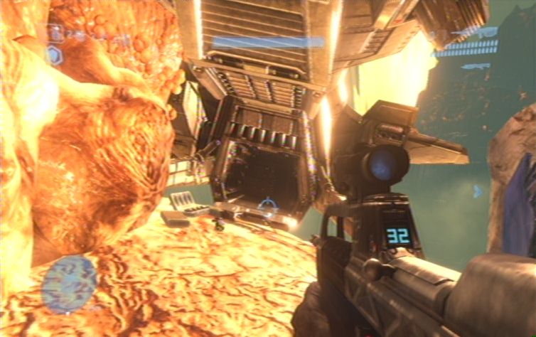 Folgt dem Pfad auf dieser Ebene, bis ihr links über eine Rampe nach unten gelangt. Widersteht nun der Gewohnheit auf die Elite zu schießen, da dies eure Verbündeten sind. Lauft also nun auf dieser Ebene weiter, haltet euch jedoch eher im Hintergrund, da ihr bereits nach einem kurzen Stück auf weitere Flood stößt. Bleibt nach wie vor im Hintergrund und arbeitet mit dem Zoom eures MGs. Am anderen Ende geht es den Hügel nach oben, und rechts in das Gebäude. Im Gang vor euch erwarten euch schon die nächsten Flood, kämpft euch durch die Gegnermassen, bis ihr weiter vorne in einem etwas größeren Raum landet. Bleibt eher weiter hinten, und visiert die Tür über euch, hinter dem Geländer, an. Genau von dort tauchen um die zwei Angriffswellen auf, erst wenn sie besiegt sind solltet ihr nach oben weiterlaufen.