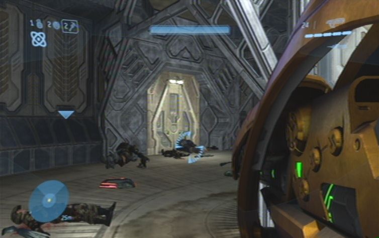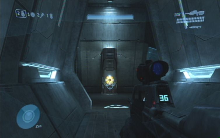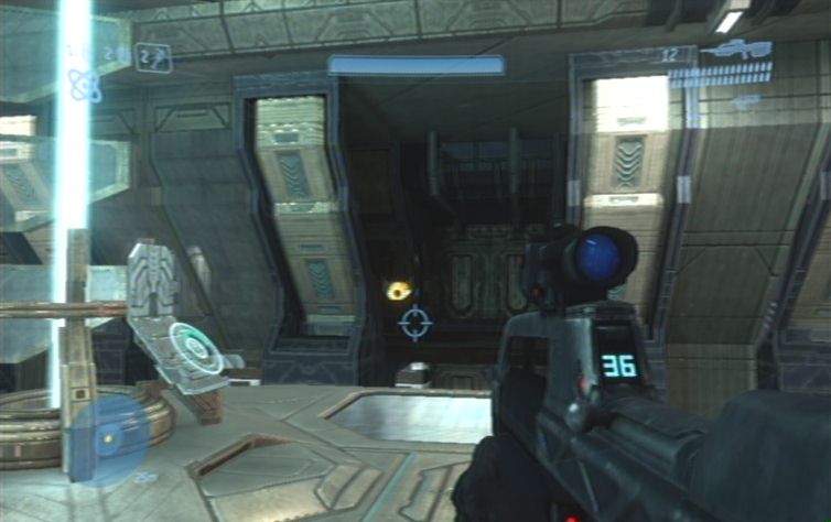 Kämpft euch nun mehr als vorsichtig diesen Gang entlang. Sehr effektiv ist das stärkere MG (das nur 3 Schuss abfeuert), die Zoomfunktion hilft zusätzlich den benötigten Sicherheitsabstand zu den Brutes einzuhalten. Gleich zu Beginn dieses Gebietes solltet ihr die Brutes von hinten überraschen, schlägt sie gleich im Nahkampf nieder, und erledigt den Rest mit der Schrotflinte. Auf eurem weiteren Weg solltet ihr immer wieder die Nebenräume erforschen, hier findet ihr nicht nur Munition, sondern auch die gefangenen Marines. Gegen Ende des Ganges erwarten euch besonders zähe Brutes, hier ist es nun insbesondere Wichtig Abstand zu halten, und nicht gleich nach vorne zu stürmen. Öffnet schließlich die Tür, im nächsten Gang haltet ihr euch rechts wo ihr auch schon die nächste Tür öffnen müsst.