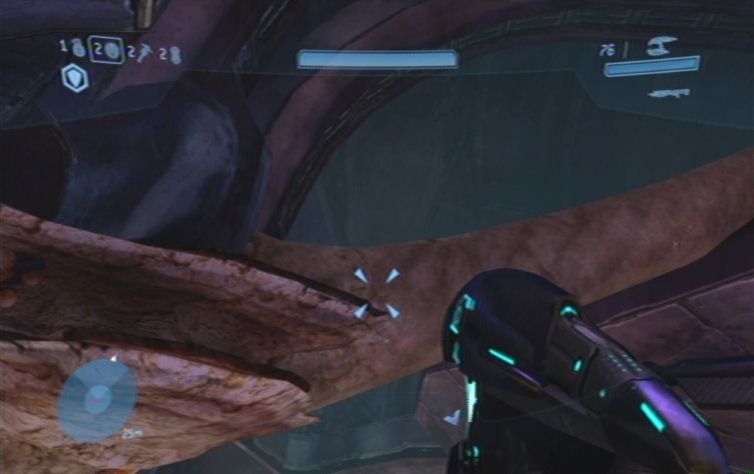 Springt nach unten, und kümmert euch um die unzähligen kleineren Feinde. Sammelt nach Möglichkeit Projektilwaffen ein, und lauft nach rechts. Folgt diesem Gang, und haltet euch eher links, hier trefft ihr auch auf eine Handvoll stärkere Feinde. Haltet euch nun am besten weiterhin links, bis ihr durch ein organisches Tor in den nächsten Raum kommt. Nachdem die Sicht wieder normal ist haltet ihr euch auch links, durch ein Tor im Boden gelangt ihr nach unten. Hier erwarten euch schon härtere Feinde, die noch dazu bewaffnet sind. Setzt am besten Projektilwaffen ein, eine Schrotflinte im Nahkampf, und ein MG für die Entfernung. Sucht euch am besten in diesem größeren Raum eines der Raumschiffteile als Deckung, und schaltet dann in Ruhe (sofern dies möglich ist) einen Flood nach dem anderen aus.
