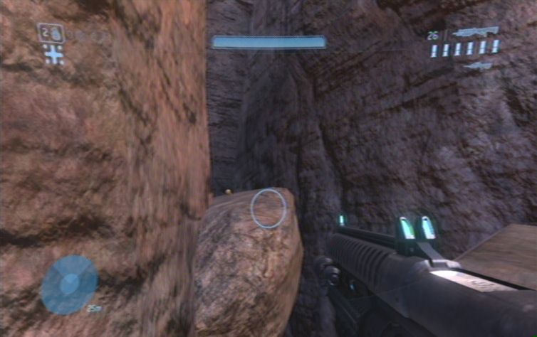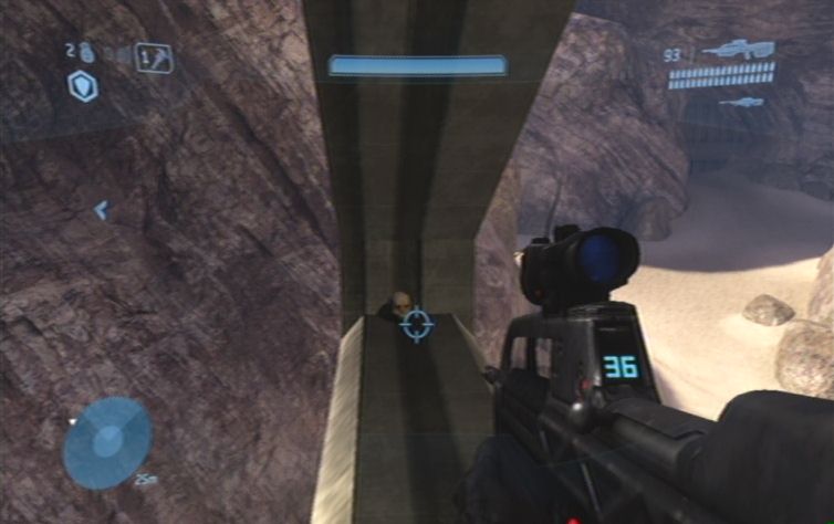 Übernehmt nun die Rolle des Fahrers, und begebt euch sofort nach rechts unten, zu dem großen Brückenähnlichen Bauwerk. In diesem kleineren Gebiet sind zwei Grunts auf Ghosts unterwegs. Wichtig ist zunächst das die Ghosts nicht zerstört werden, da ihr sie möglicherweise später gebrauchen könnt. Macht euch nun auf zu der anderen Seite des Gebietes, wo es rechts nach oben weitergeht. Fahrt nur ein kleines Stück dieses Tal nach oben, und springt schließlich ab. Rechts, neben der Felswand, befinden sich einige größere Steine. Springt zunächst auf den kleineren, und von diesen weiter, und schließlich nach links oben. Lauft nun immer weiter auf die Struktur zu, um schließlich auf diese zu springen.