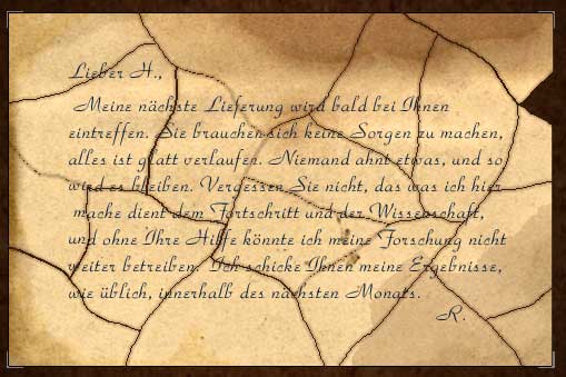 Nach einem längeren Gespräch mit Dr. Hermann finden Sie sich wieder draußen. Untersuchen Sie den Müllcontainer, in den Dr. Hermann anfangs etwas reinwarf. Der Container ist abgeschlossen, aber die Tonne daneben nicht. Setzen Sie die Brieffetzen wieder zusammen: