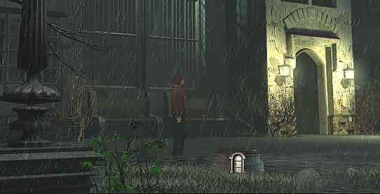 Nachdem Sie aus dem Fenster geklettert sind, gehen Sie zu Richards Labor, Sie finden eine abgeschlossene Tür vor. Gehen Sie zurück zum Garten und heben Sie die kleinen Steine auf der Brücke auf. Etwas weiter rechts sehen Sie beleuchtete Turmfenster, werfen Sie die Steine dagegen, um Richards Aufmerksamkeit zu erringen.