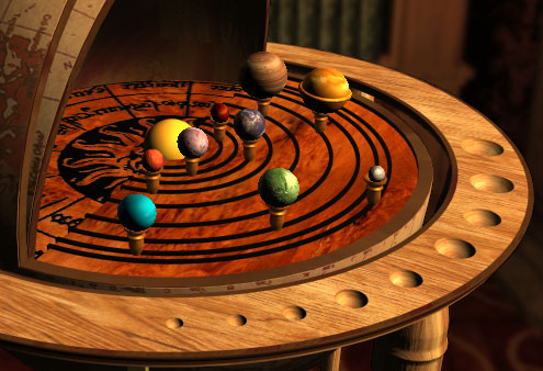Unter dem Tintenfass ist ein Knopf, mit dem Sie einen Geheimschrank öffnen können. Dem Schrank entnehmen Sie eine Schachtel mit aus Holz gefertigten Planetenmodellen unseres Sonnensystems.
