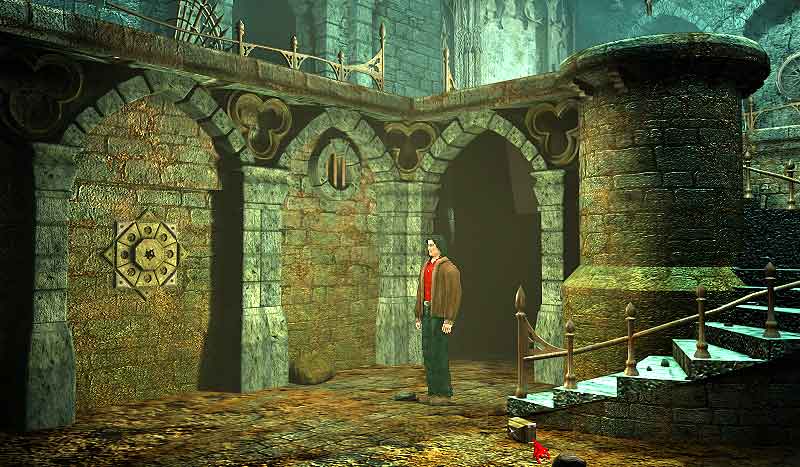 Untersuchen Sie das Gitter unweit des Eingangs. Es ist verschlossen. Unterhalten Sie sich daraufhin mit dem Pater am Altar. Nachdem der Geistliche das Gitter aufgemacht hat, suchen Sie die leuchtende Öffnung in einer Säule.