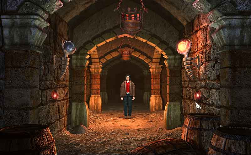 Begeben Sie sich in den Keller von Black Mirror und nehmen Sie vom Wasserbrunnen das Seil mit dem Haken an sich. Werfen Sie eine Münze in den Kanalschacht hinter dem Schleifstein und steigen Sie hinab.