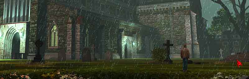 Rechtsklicken Sie auf die Karte im Inventar und gehen Sie zur Kirche von Warmhill. Sowohl der Haupt- als auch der Seiteneingang der Kirche sind verschlossen. Befragen Sie den Totengräber unweit des Seiteneingangs. Links an der Kirche vorbei geht es zum hinteren Friedhof. Untersuchen Sie dort das Grab von William und die Grüfte daneben. Ein weiteres Gespräch mit dem Totengräber führt die Handlung fort.